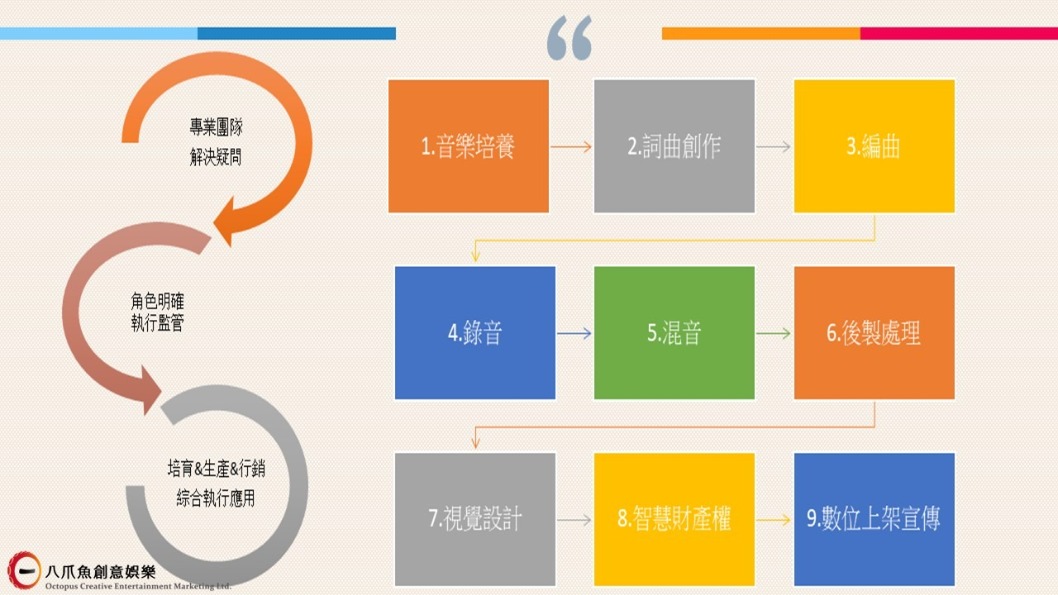 step1:音樂培養step2:詞曲創作step3:編曲step4:錄音step5:混音step6:後製處理step7:視覺設計step8:智慧財產權step9:數位上架全流程-完成IP價值市場模式
